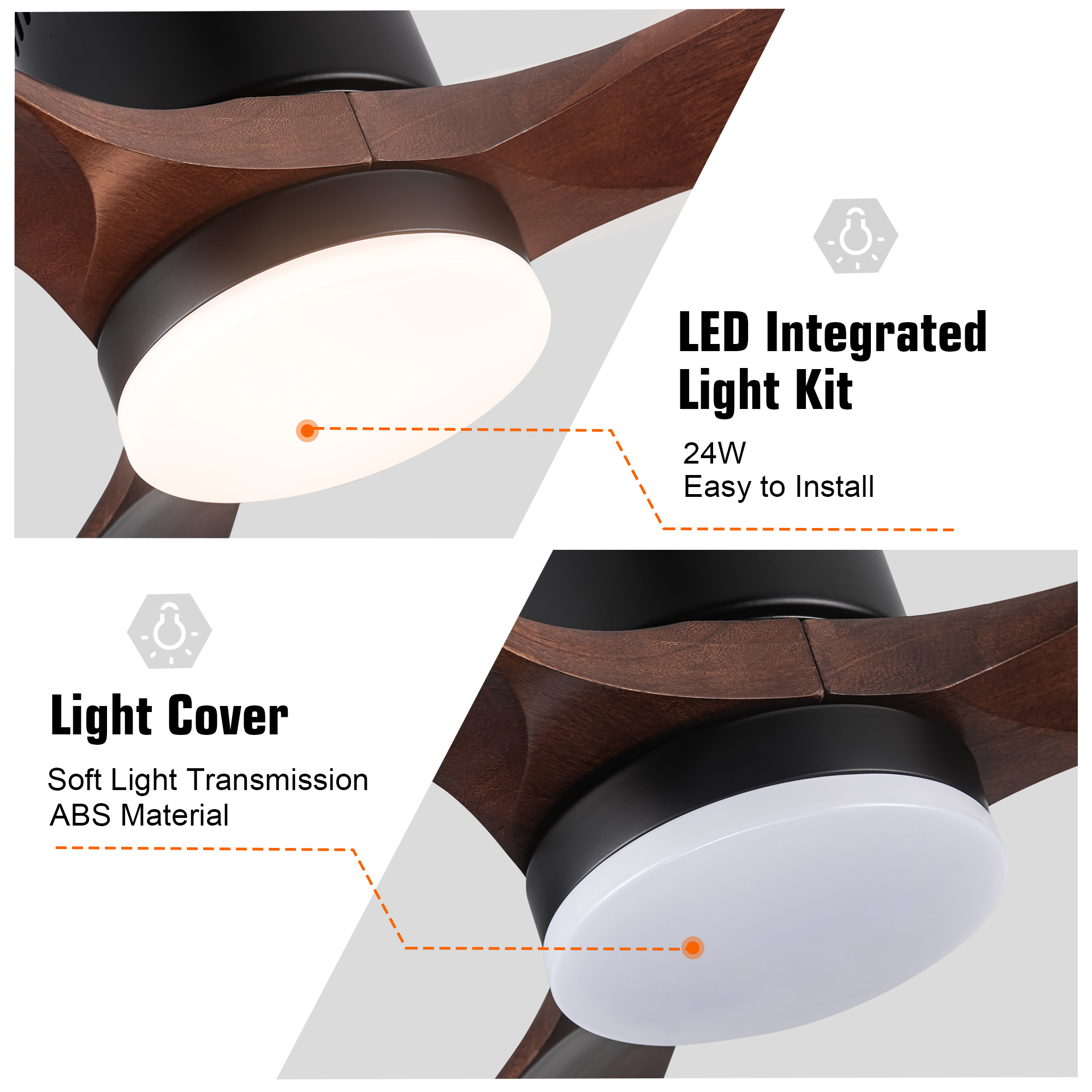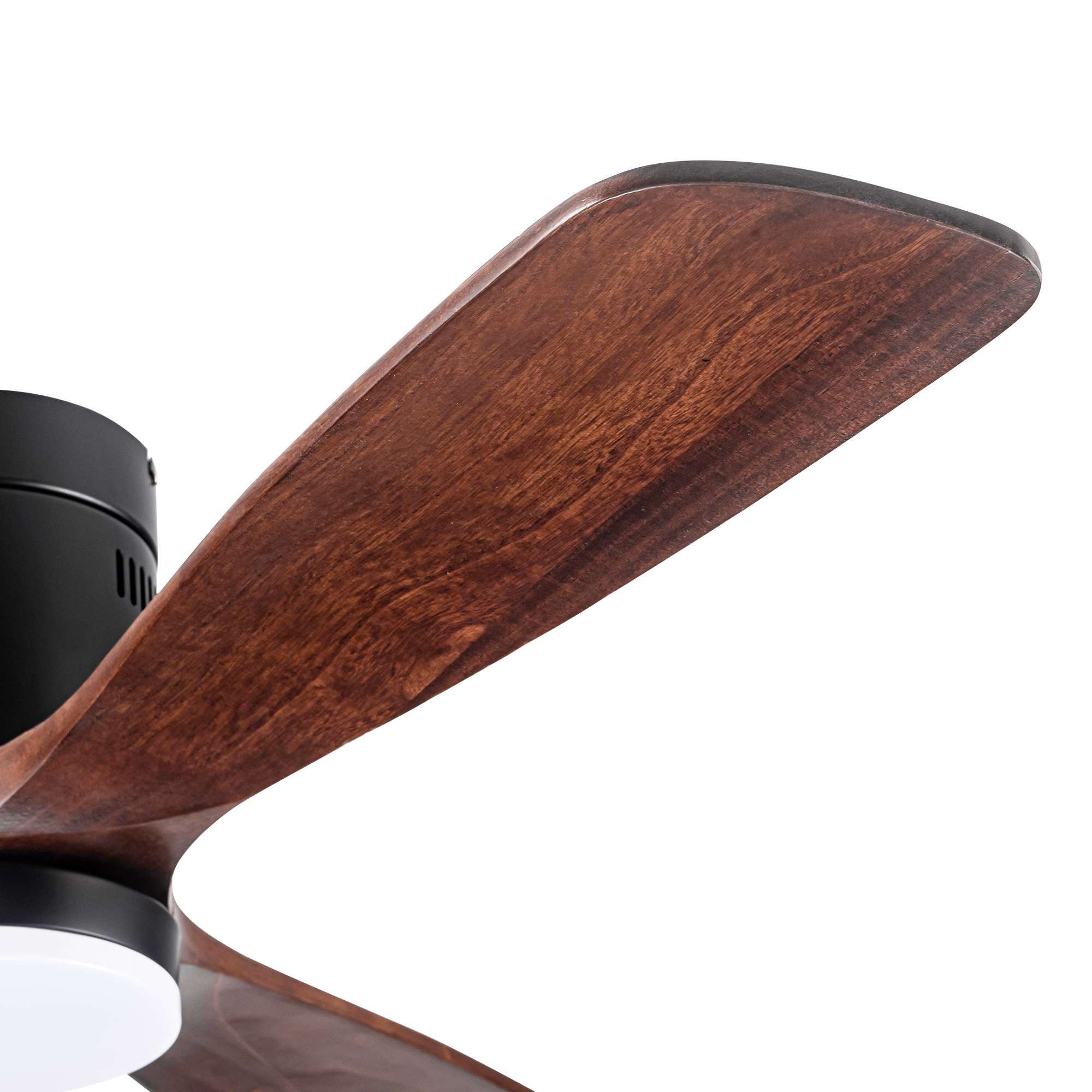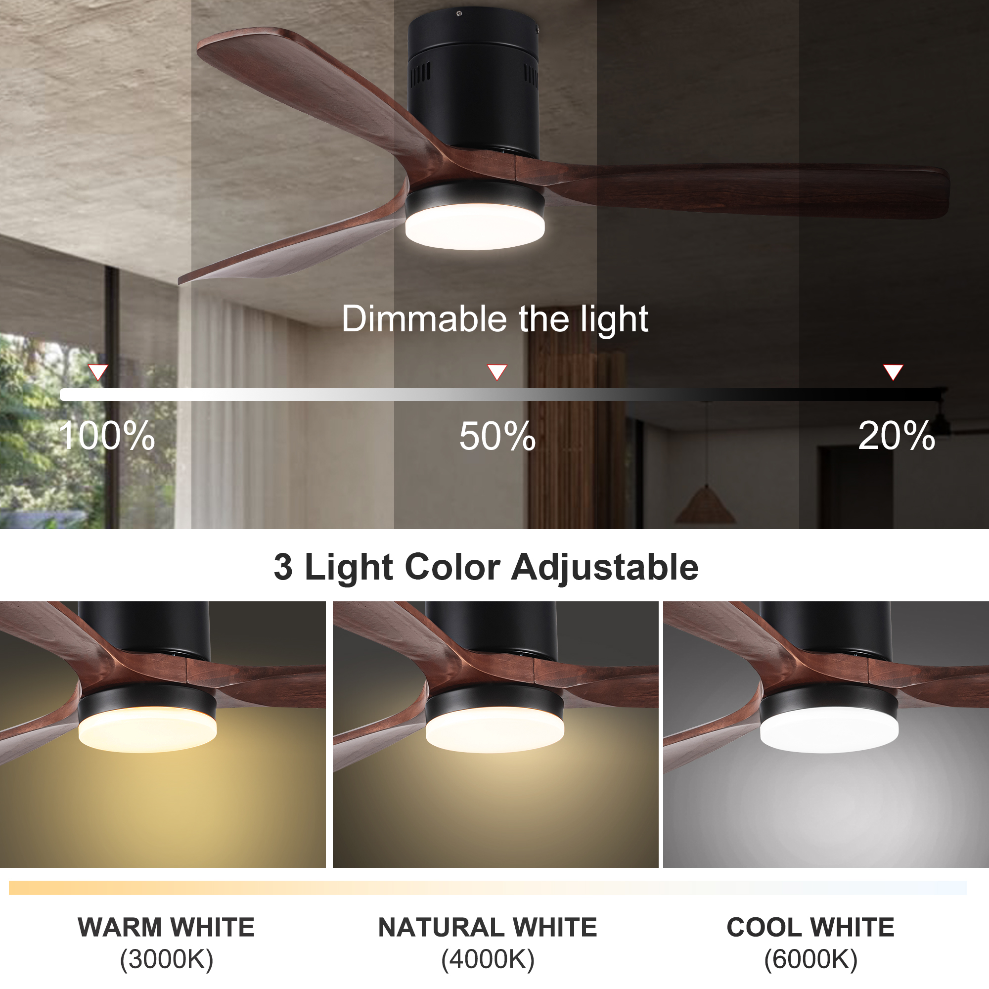 This 52 inch brown solid wood blades ceiling fan will fit perfectly into your living room, balcony, bedroom and other larger rooms. The high quality solid wood blades will last many years and the powerful silent motor provides two modes of wind, cool mode when the wind is blowing downward and warm mode when the wind is blowing upward. 6-speed wind control, you can adjust the wind speed as you like and its max airflow is up to 5000, which can improve air circulation very well. 24W LED light provides 2000 lumens for night lighting needs, and it has three color temperatures to select from (cool, neutral, warm). the DC motor is more energy efficient than traditional fans, saving 70% of energy compared to AC motors.
