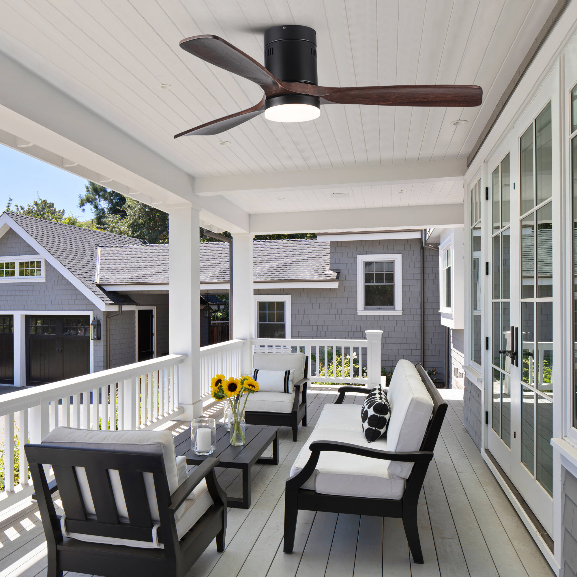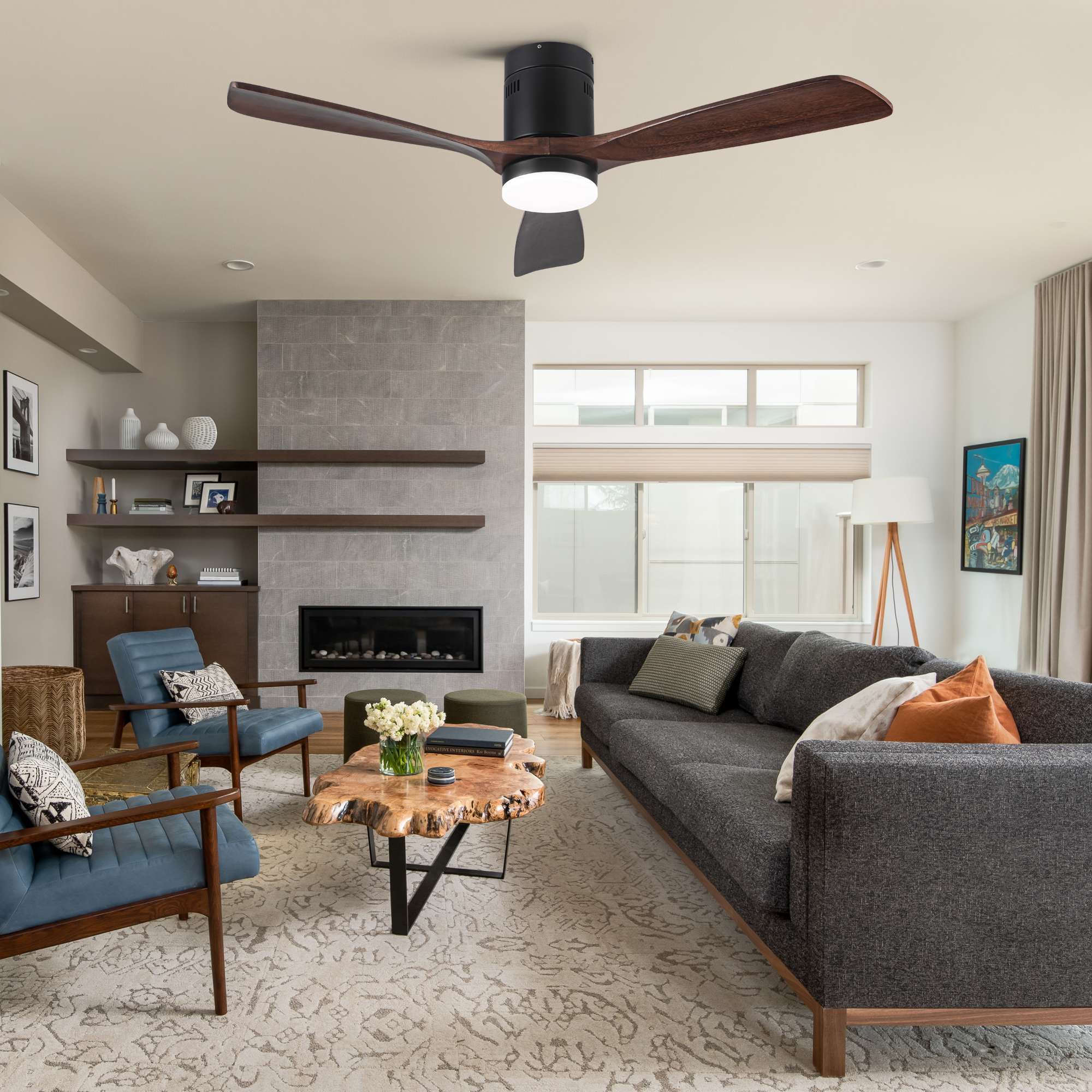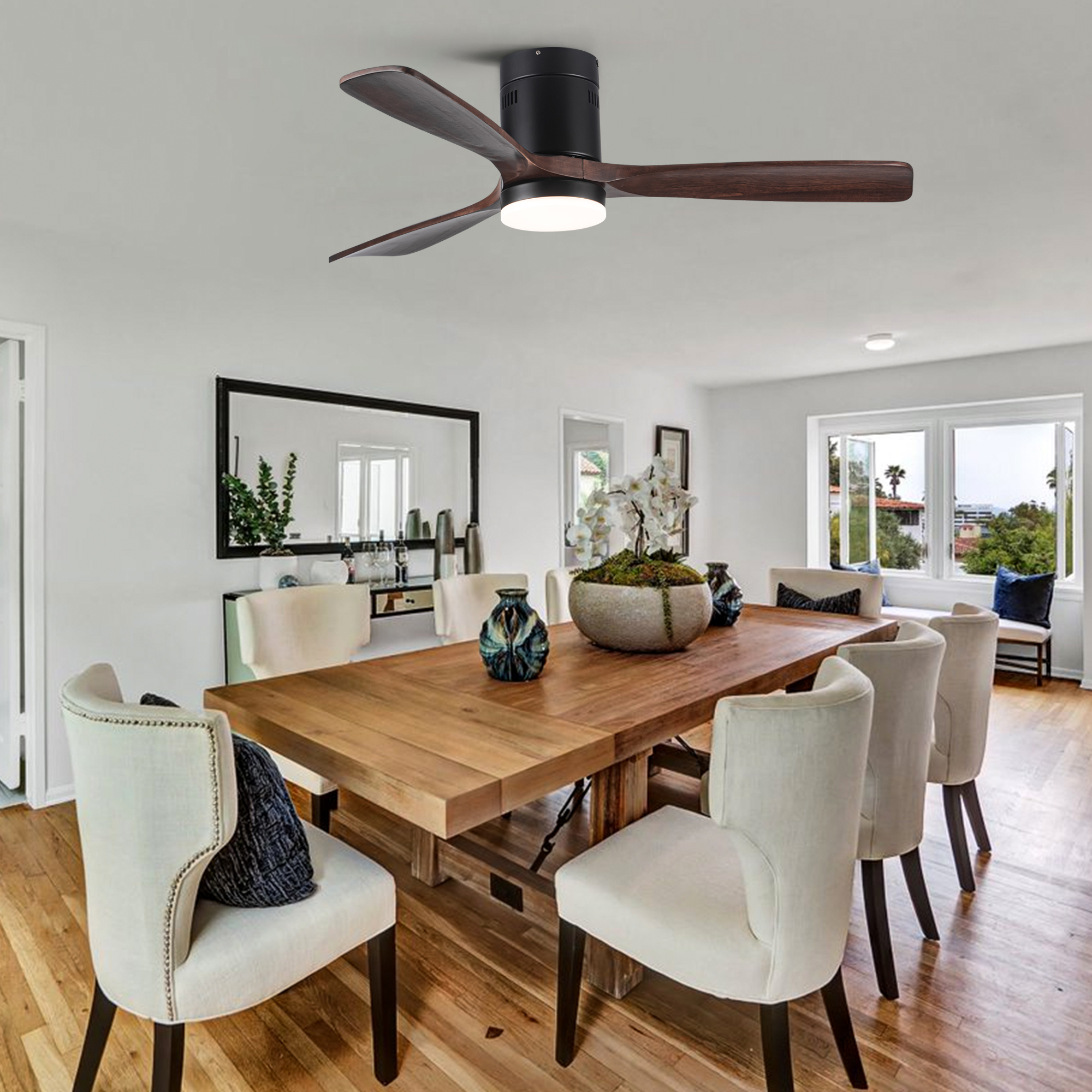 This 52 inch brown solid wood blades ceiling fan will fit perfectly into your living room, balcony, bedroom and other larger rooms. The high quality solid wood blades will last many years and the powerful silent motor provides two modes of wind, cool mode when the wind is blowing downward and warm mode when the wind is blowing upward. 6-speed wind control, you can adjust the wind speed as you like and its max airflow is up to 5000, which can improve air circulation very well. 24W LED light provides 2000 lumens for night lighting needs, and it has three color temperatures to select from (cool, neutral, warm). the DC motor is more energy efficient than traditional fans, saving 70% of energy compared to AC motors.
